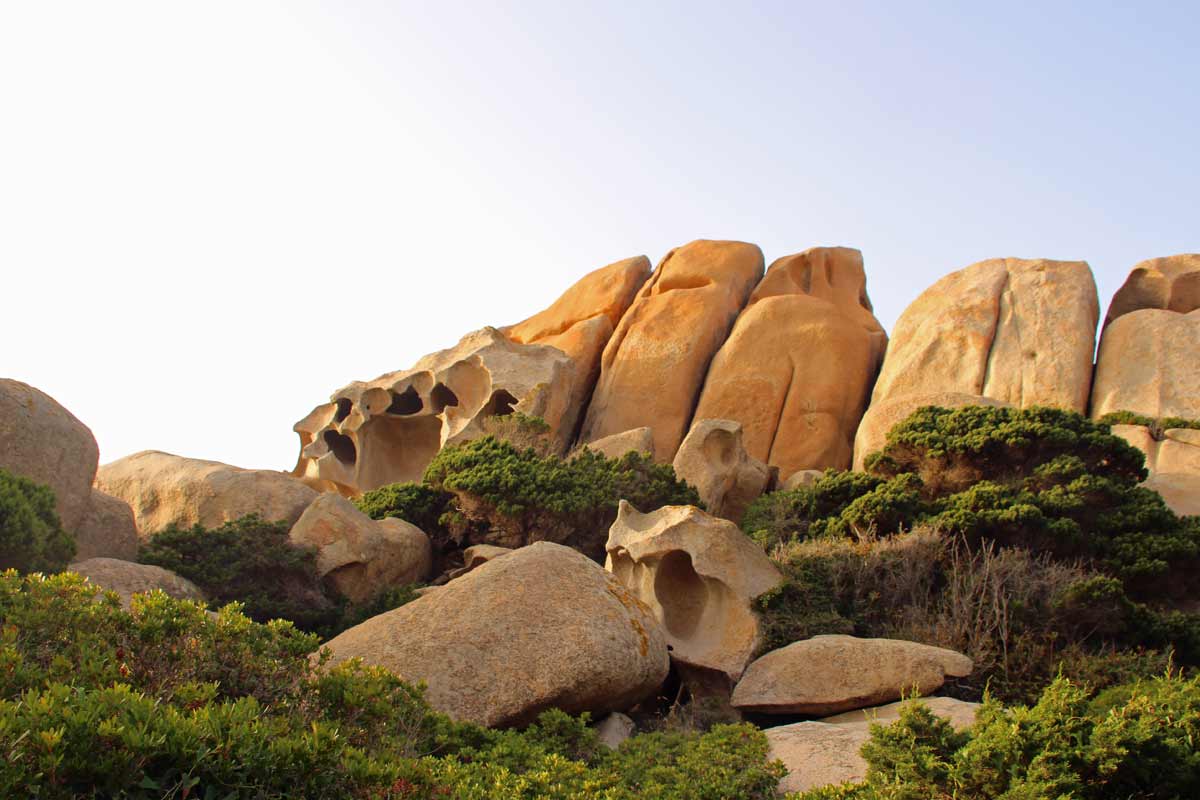 Die Halbinsel Capo Testa liegt ganz oben im Nordwesten von Sardinien und ist ein einzigartiges Naturparadies. Die Gegend um Capo Testa zeichnet sich durch zahlreiche monumentale, bizarr strukturierte Granitformationen aus, die wie steinerne Fantasiegebilde aussehen und an Tiere oder Fabelwesen erinnern. Von hier oben aus siehst du an klaren Tagen bis nach Korsika, das nur noch 12 km entfernt ist. Zwischen den einzelnen Felsen findest du verschwiegene kleine Sandbuchten, die zum schwimmen und schnorcheln einladen. Da die Anreise etwas beschwerlich ist und du die Buchten nur über steile Felsabstiege erreichst, ist es hier nicht so überlaufen.