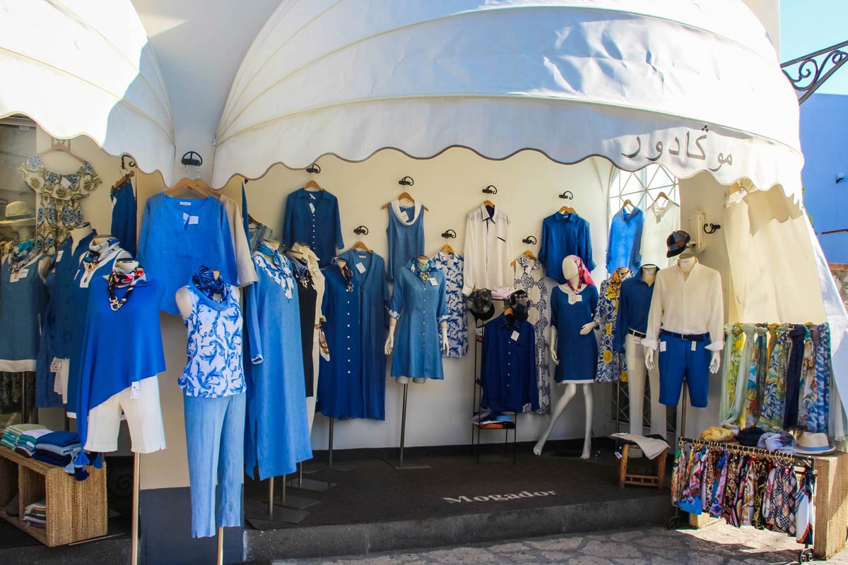Begib dich jetzt in die verwinkelte kleine Altstadt von Anacapri, vorbei an zahlreichen hübschen Geschäften mit Kunsthandwerk und Souvenirs. Besonders beliebt sind als Mitbringsel alle Produkte aus Zitrone, allen voran der Limoncello- Likör. Aber auch hochwertige Strickwaren und Kleider im typischen „Azzuro“-Blau von Capri.