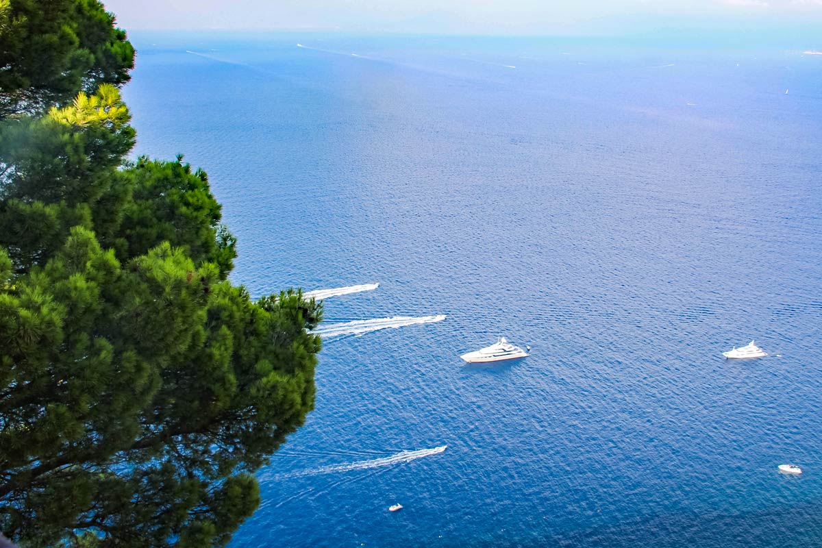 Parke deinen Roller am Stadteingang (nur kostenpflichtig, auf für Mopeds) und schlendere über die Via Roma und vorbei an der Piazza Umberto weiter zur Via Tragara. Lasse Capri Stadt erst einmal links liegen, den Besuch dort holst du besser später nach. Folge der Via Tragara etwa anderhalb Kilometer. Unterwegs findest du zahlreiche Aussichtspunkt mit Blick auf Marina Piccola. Am Ende kommst du an eine große Aussichtsterrasse mit einem tollen Blick auf die berühmten Faraglioni Felsen