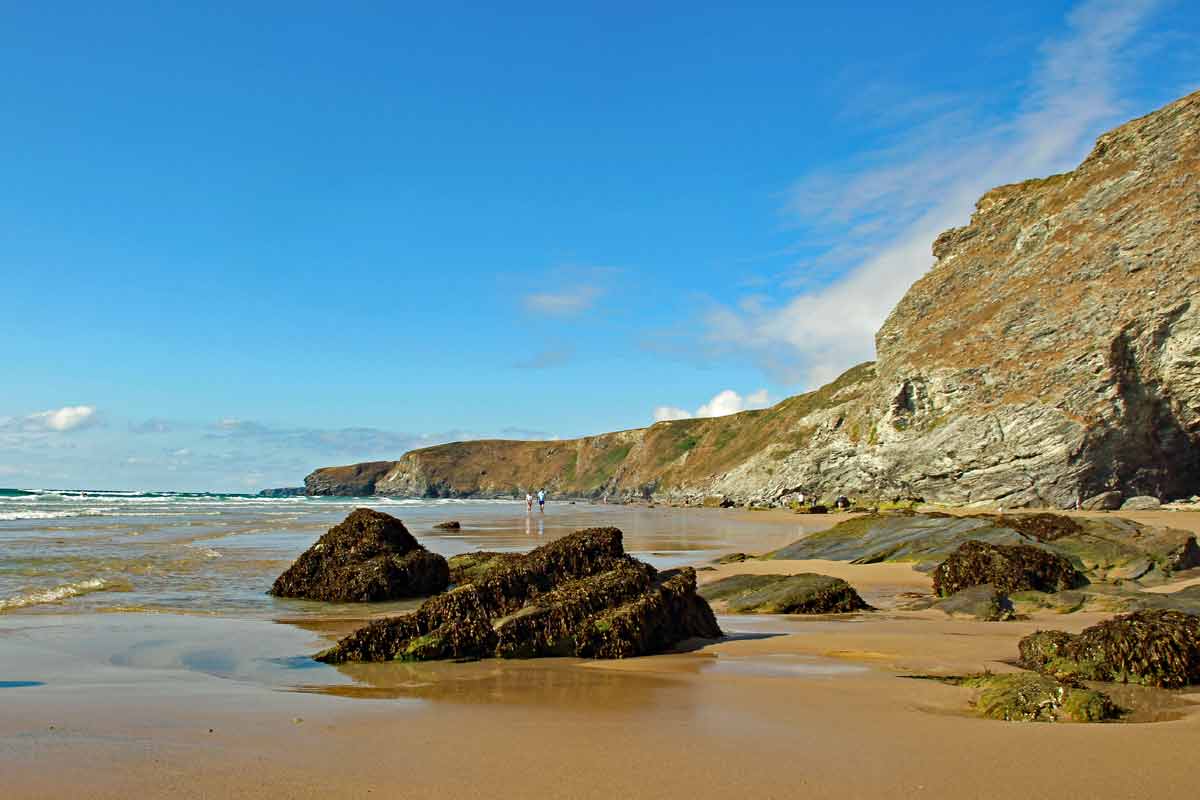 Rund um den beliebten Badeort Newquay findest du zwei große und gut besuchte Badestrände. Südlich der Stadt liegt der berühmte Surfstrand Fistral Beach und etwas nördlicher der etwas ruhigere Strand Watergate Bay. Beide verfügen über gute Infrastruktur von Restaurants, Cafés, Shops und Surfschulen. Große Lifeguardstationen machen das Schwimmen hier sehr sicher. Toiletten und Duschen sind ebenso vorhanden, wie ausreichend Parkmöglichkeiten. An beiden Stränden steht das Wellenreiten an erster Stelle und gerade in Fistral Beach herrschen gute Anfängerbedingungen. An der Watergate Bay musst du zeitweise mit Petermännchen rechnen. Das sind kleine Fische, die sich im Sand eingraben und ziemlich unangenehm stechen können, wenn du auf sie drauf trittst. Deshalb werden hier Wasserschuhe empfohlen.