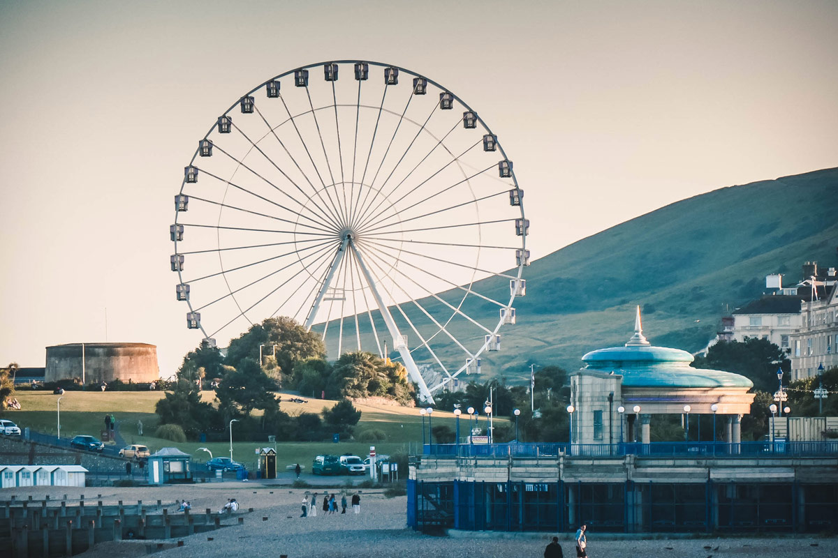 Folgst du der blumenreiche Promenade weiter nach Westen gelangst du zu den Western Lawns mit dem Eastbourne Eye, einem mobilen Riesenrad von knapp 50 Meter Höhe. Es steht nur in den Sommermonaten hier und bietet eine schöne Aussicht auf die Promenade, den Pier und die Küste. Von den erhöhten Rasenflächen überblickst du den ganzen Strand von Eastbourne.