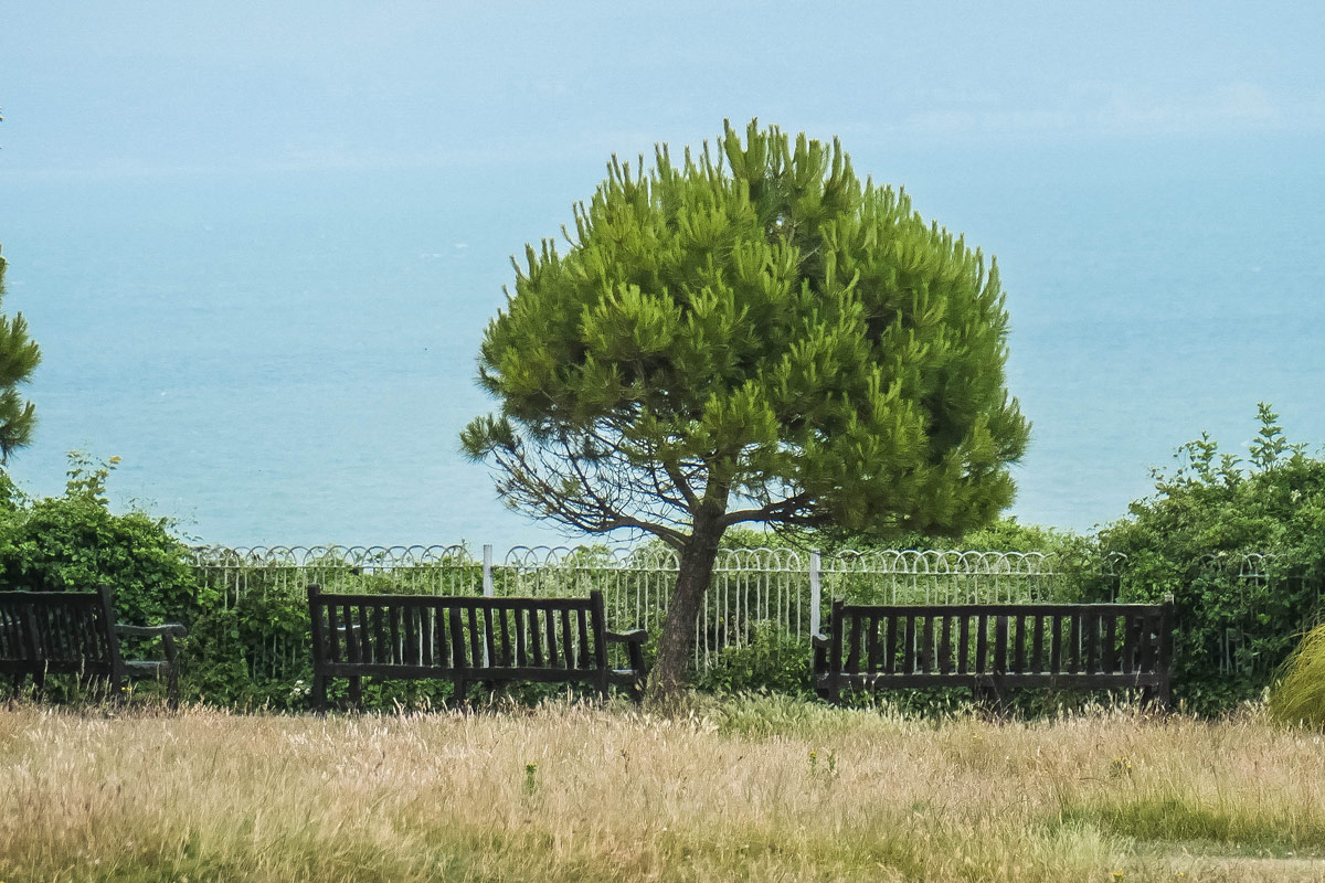 Hinter den Cottages führt der Weg bergauf, weg vom Ufer. Nach der Steigung erreichen wir eine größere Grünfläche, wo neben dem örtlichen Bowling Green ein öffentlicher Park ist: Helen‘s Garden. Neben einigen Blumenrabatten haben wir von hier einen tollen Ausblick auf den Ärmelkanal und das tief liegende Eastbourne. Es gibt dort einen kleinen Coffeeshop, wo wir uns noch einmal stärken, bevor wir uns auf den Weg nach Beachy Head machen.