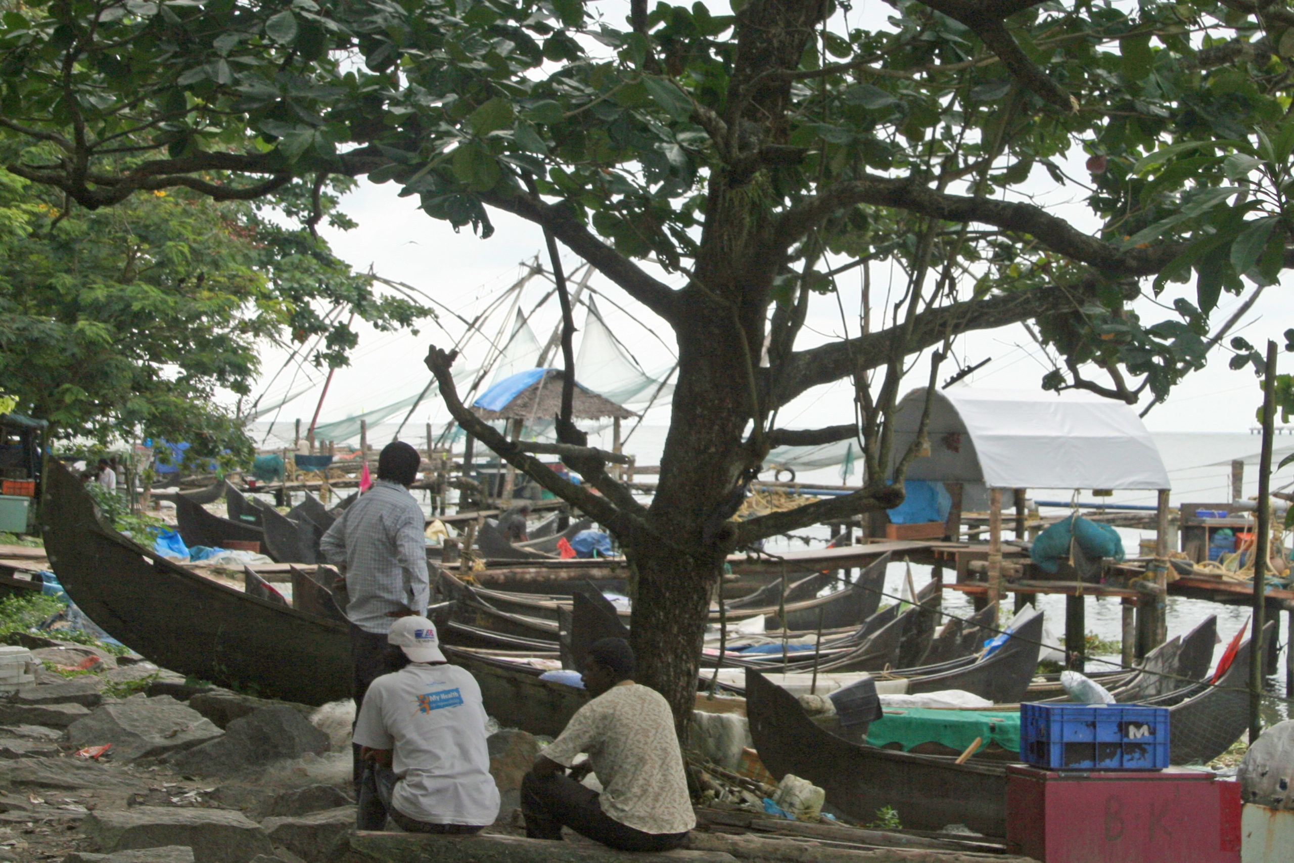 Wir brechen auf um das koloniale Fort Cochin zu entdecken. Direkt vor dem Hoteleingang folgen wir langen, schmalen Gassen mit Schneiderein, Kunsthandwerkern und anderen kleinen Läden des täglichen Bedarfs. Wir stoßen auf einen Schrottplatz mitten auf der Straße, der völlig mit Pflanzen überwuchert ist, geraten in eine christliche Hochzeit und werden mit Begeisterung eingeladen, am Fest teilzunehmen und gelangen schließlich zum Fischmarkt am Ufer des Sees. Wir bewundern die berühmten chinesischen Fischernetze, mit denen hier auf ganz traditionelle Weise noch heute gefischt wird. Besonders schön ist es dort zum Sonnenuntergang. Zwischen den Fischständen grasen Ziegen und picken Hühner und sogar ein Kätzchen sitzt zwischen dem frischen Fang, während über uns im Baum ein Streifenhörnchen tobt.