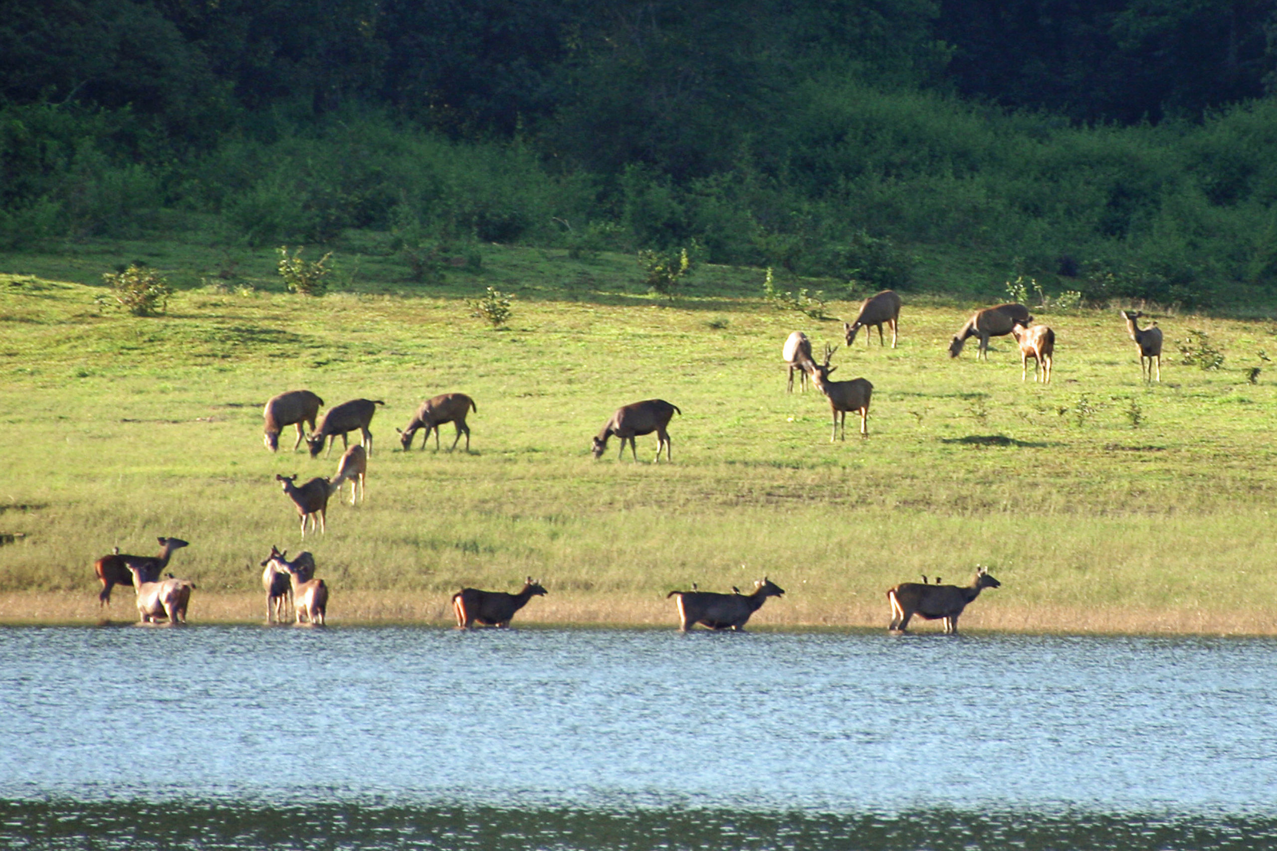 Unsere Nacht war kurz, denn um 5:15 Uhr klingelt bereits der Wecker und im Dunkeln starten wir im offenen Jeep zur Fahrt in den Periyar Nationalpark. Am Eingang des Parks stauen sich schon die Jeeps und im Konvoi geht es weiter den Hügel hinauf. Inzwischen kämpft sich die Sonne durch den Morgennebel und taucht die Landschaft in ein mystisches Licht. Da der Wald sehr dicht ist und viele Fahrzeuge unterwegs sind, ist es schwierig Tiere zu sehen. Wir treffen auf einige Affenarten, einen erhabenen Sambahirsch und diverse Flughörnchen.