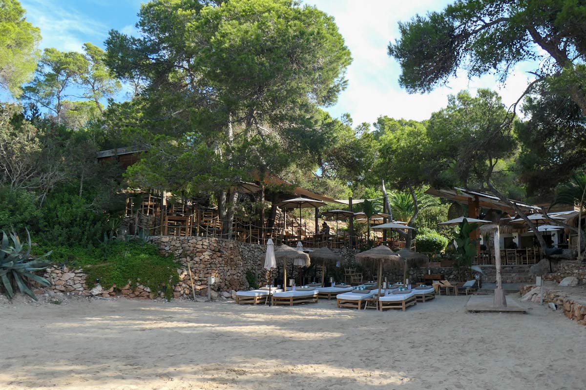 Einige Pinien spenden Schatten. Da die Bucht zwar direkt mit dem Auto angefahren werden kann, aber der Weg doch eher einer Offroadpiste gleicht, ist sie selten sehr voll. Am östlichen Ende der Badebucht findest du die chillige Beachbar "Soulgood" wo es hausgemachte Limonade und leckere Sandwiches gibt. Wenn du nun noch etwas weiter Richtung Santa Eularia wanders, kommst du nach 10 weiteren Minuten an eine Felsbucht auf dessen Plateau der schicke Beachclub "Babylon" trohnt. Hier finden in den Sommermonaten Live-Events mit DJ's statt und die Aufmachung des Club ist schon etwas besonderes.