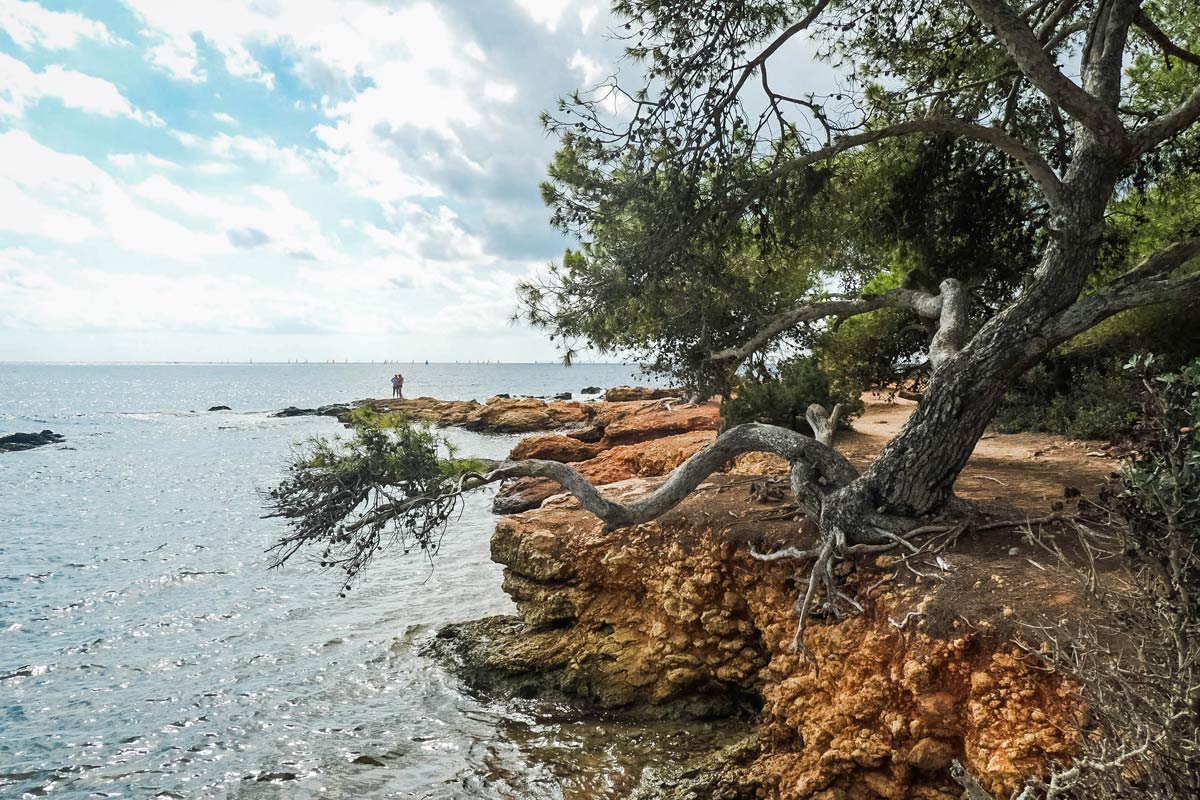 Für diese Wegstrecke brauchst du etwa 30 Minuten. Auf dem Teilstück genießt du wunderschöne Ausblicke auf die Küste, das Meer und an klaren Tagen bis zur Insel Formentera. Du wanderst unter schattigen Pinien entlang der fjördartigen Felsküste, vorbei an versteckten Villen und kleinsten Buchten. Immer wieder bieten sich lauschige Plätzchen auf Baumstämmen zum Inne halten und ausblicken.