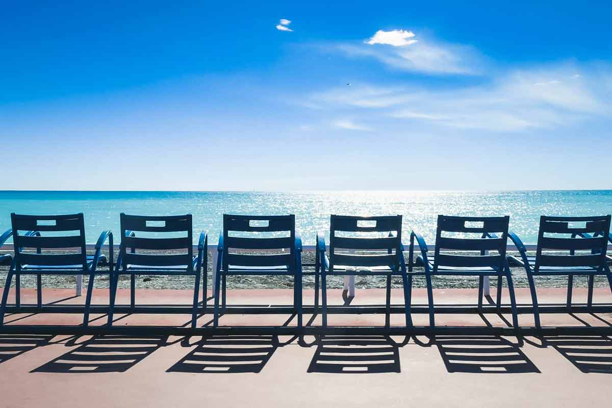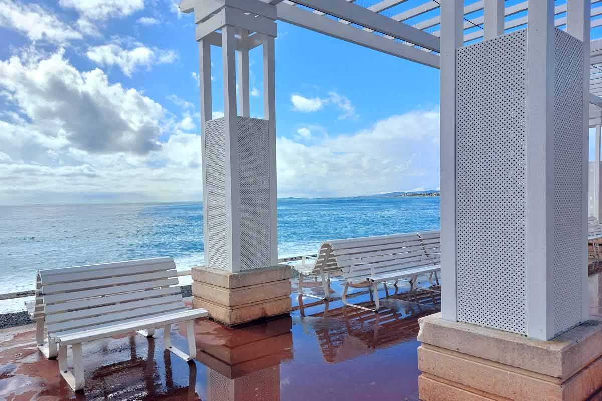 Wahrzeichen an der Promenade sind - neben dem weltberühmten Hotel Negresco- die azurblauen Stühle, die ordentlich aufgereiht zum Verweilen mit Blick auf das offene Meer einladen. Neu dazu gekommen sind vor einigen Jahren die filigranen weissen Pergolen, die im Sommer Schatten spenden und beim Sonnenuntergang dem Licht einen schönen Rahmen verleihen. Die vielen schlanken Palmen, die über sieben Kilometer die Promenade säumen, sorgen dafür, dass aus der Uferstraße eine mondäne Flaniermeile wird.