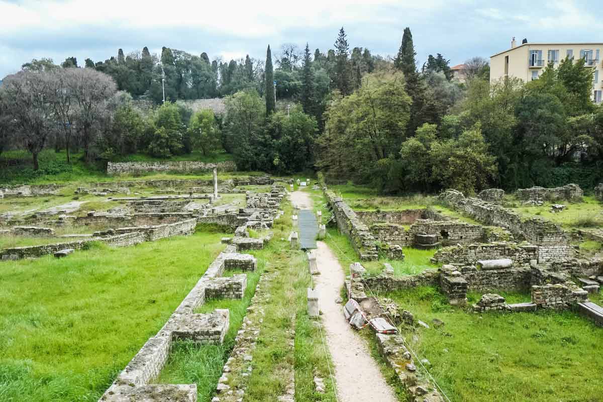 Bei der Bushaltestelle „Arénes/Musée Matisse“ beginnst du deinen Rundgang durch Cimiez. Du stehst bereits am Eingang der Arena, deren fast kreisrunden Außenmauern noch in Teilen erhalten sind. Gegenüber der Arena liegt das Archäologische Museum mit großem Freigelände und Überresten einer römischen Therme. Leider war beides bei meinem Besuch wegen Bauarbeiten nicht zugänglich.