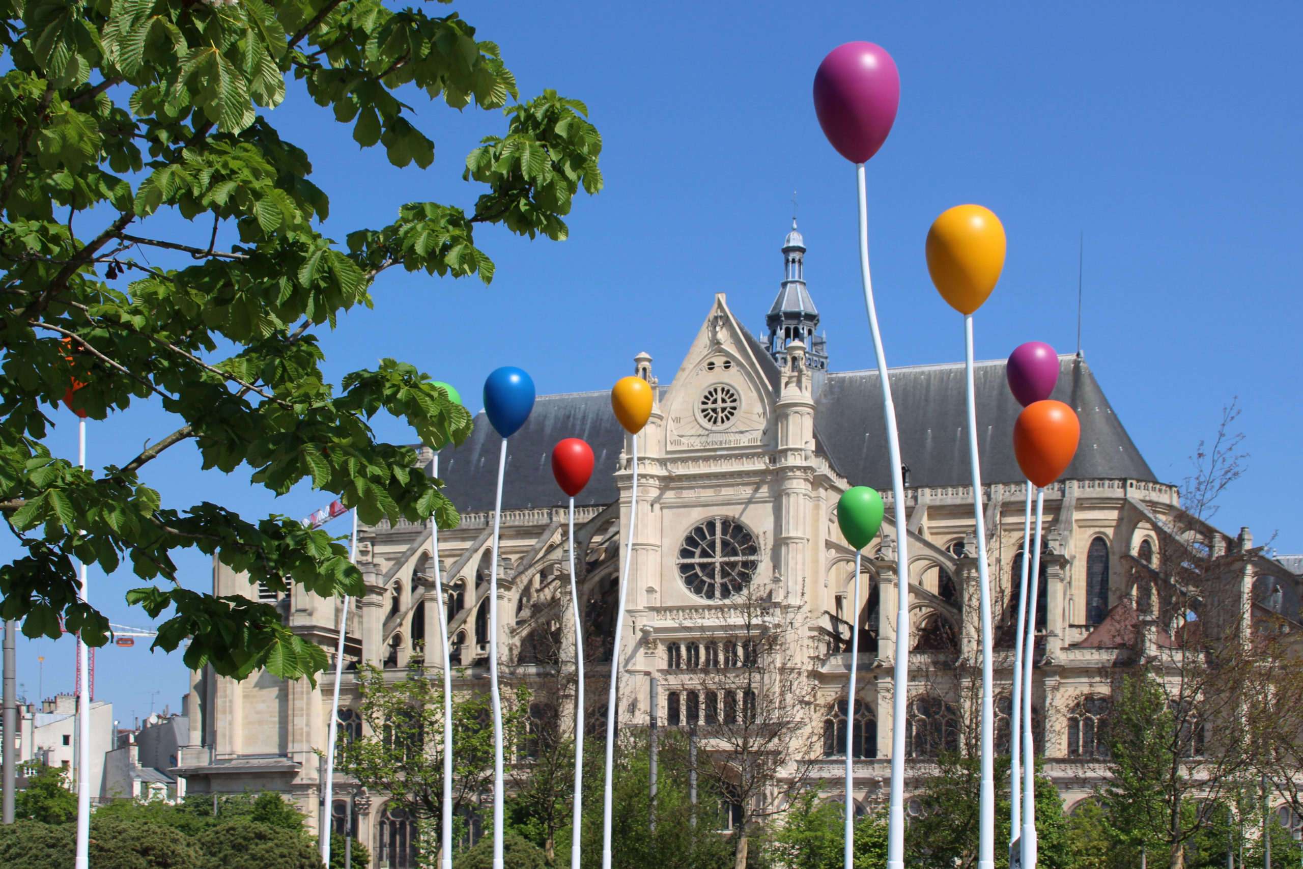 Luftballons vor einer Kirche in Paris