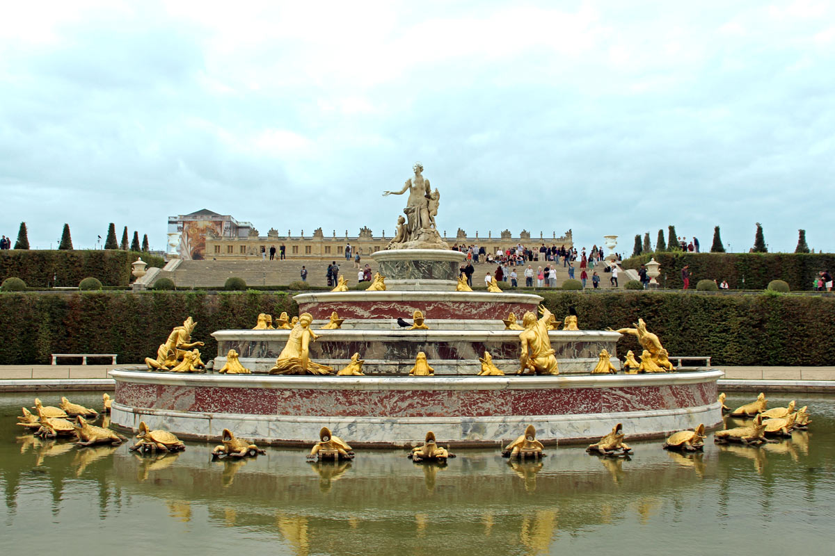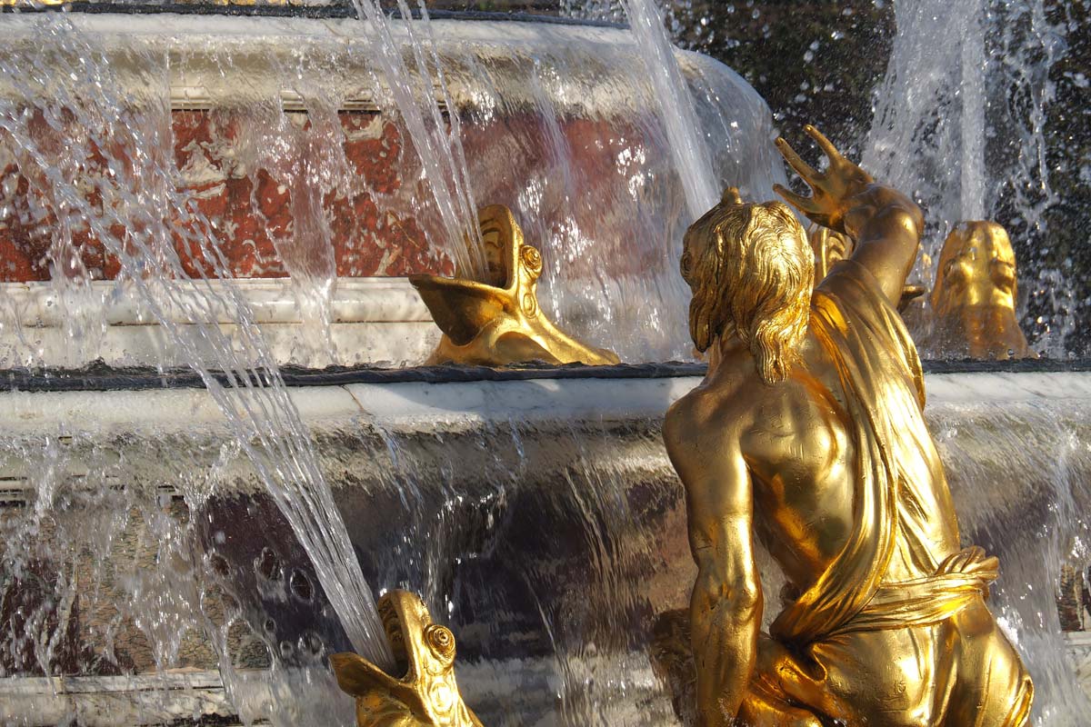 Die Wasserflächen auf den oberen Terrassen des Schlossen wurden von Le Notre so angelegt, dass sich die Fassade des Schlosses immer wieder darin spiegelt und gleichzeitig inszenierte der Gartenbauer hier gekonnt Allegorien aus der griechischen Mythologie. Die beiden beeindruckensten Wasserspiele sind der Brunnen der Latona und der große Appolobrunnen am Fusse des Grand Canal. Aber auch der Drachenbrunnen, der Neptunbrunnen, sowie die Brunnen der vier Jahreszeiten sind wunderschön anzusehen. Eine sehr gute und interessante Erklärung zu allen Brunnen, ihrer Bedeutung und auch ihrer Funktion findest du auf der Seite von hisour.