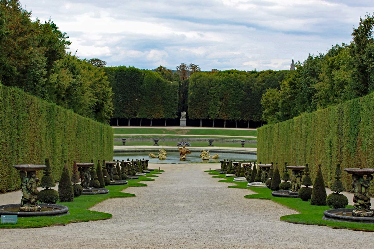 Der vom berühmten Gartenarchitekten Andre Le Notre zwischen 1662 und 1689 erschaffene Park von Versailles erstreckt sich über einen Fläche von mehr als 815 Hektar und umfasst 43km Wege und mehr als 75.000Bäume, sowie mehrere große Gewässer, knapp 1200 Brunnen, Fontänen und Wasserspiele und terrassenförmig angelegte Blumenrabatten. Vom Schloss aus öffnet sich der Park über Treppen und Brunnen bis hinunter zum Grand Canal, einem künstlich angelegten See. Rechts und links des Schlossen finden sich ebenfalls weitere Seen, sowie die beiden Lustschlösschen Grand Trianon und Petit Trianon, das arkadische Dorf der Königin Marie Antoinette, sowie eine eigene Reitschule, Kutschengebäude und eine Orangerie. Die ganze Schönheit und der Reichtum des Parks ist kaum an einem Tag zu erleben. Ich versuche dir hier einige Impressionen zu vermitteln.