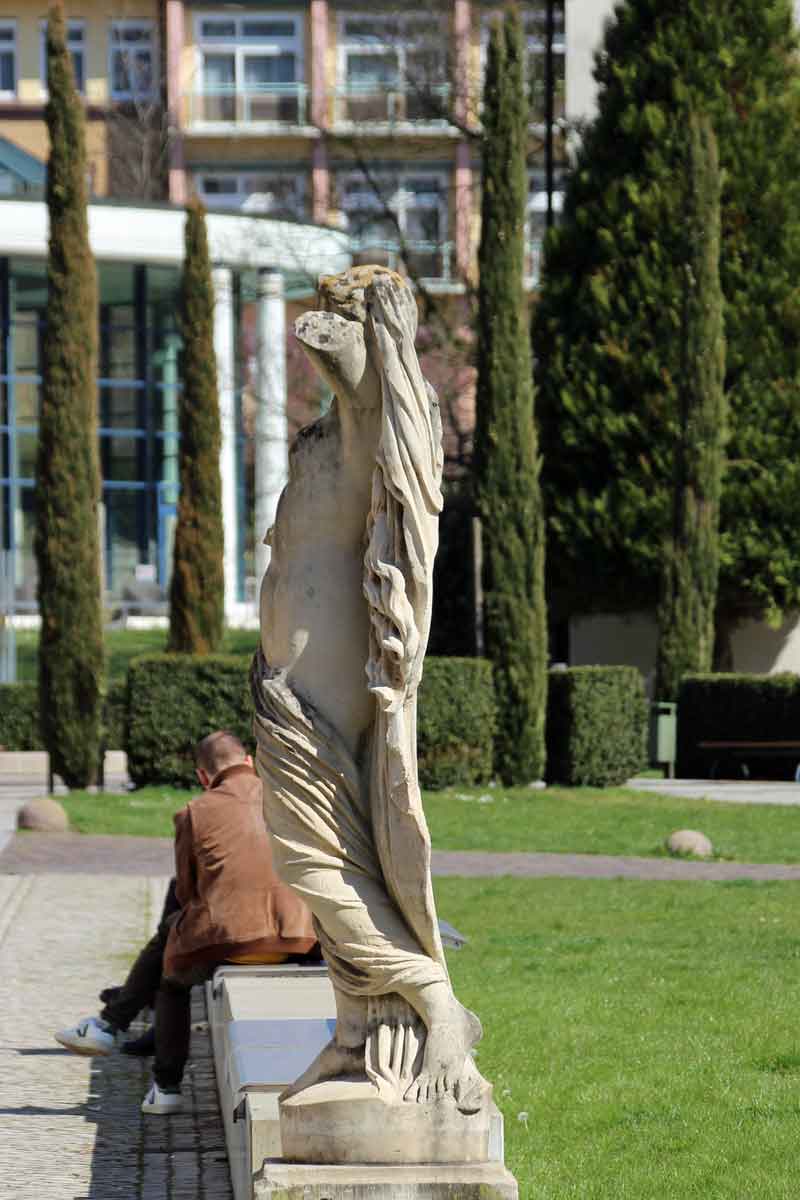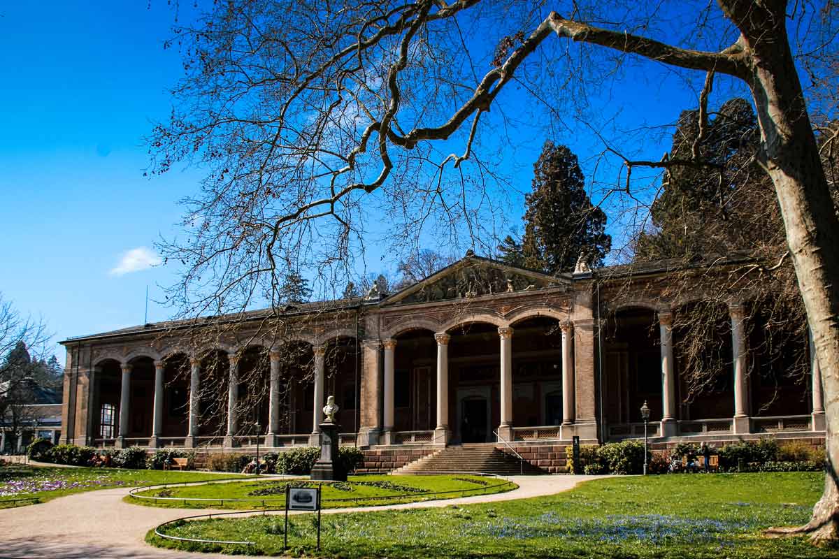Rechter Hand gelangst du zur berühmten Trinkhalle. Die 90 Meter lange offene Wandelhalle wird von 14 großen Wandgemälden geziert, die Sagengeschichten aus dem nördlichen Schwarzwald erzählen. Im 19. Jahrhundert waren „Trinkkuren zur Gesundheistsförderung“ sehr beliebt und so wurde die Trinkhalle über der sprudelnden Thermalquelle errichtet. Inzwischen weiß man, das das schwefelhaltige Wasser nicht förderlich ist und es wird vom Verzehr abgeraten. Dennoch ist die Baden Badener Trinkhalle ein hübsches Relikt aus dieser Zeit und bildet mit dem davor gelegenen Kurpark eine schönes Motiv.