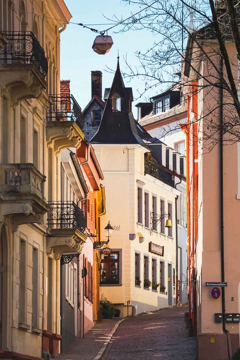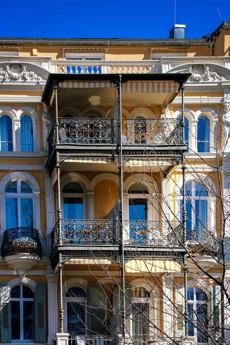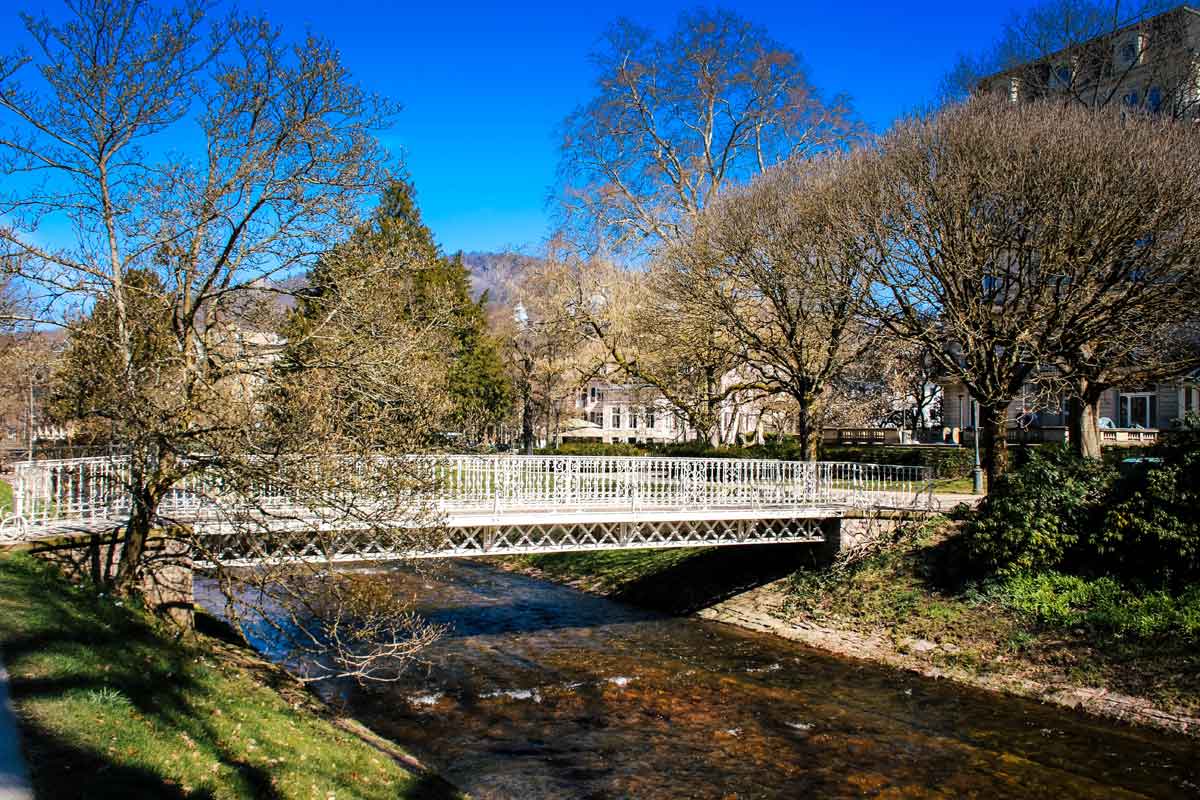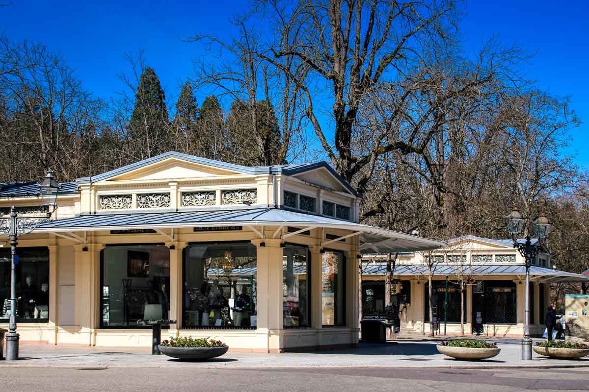 Folge nun dem Wasserlauf des Paradies wieder bergab und biege dann rechts in die Bernhardstrasse und direkt wieder rechts in die Scheibenstrasse. An der nächsten Gabelung folgst du rechts der Vincentistrasse talwärts und nimmst dann kurz darauf eine kleine Fußgängergasse bergab. Überquere die Straße direkt bei der Schule und nimm den Fußweg seitlich davon. Schon erreichst du das Baden Badener Bäderviertel. Dieses entstand erst, als die Bedeutung Baden Badens nach einem Verbot des Glücksspiels im Jahr 1872 abzunehmen drohte und die Stadt sich neu positionieren musst.